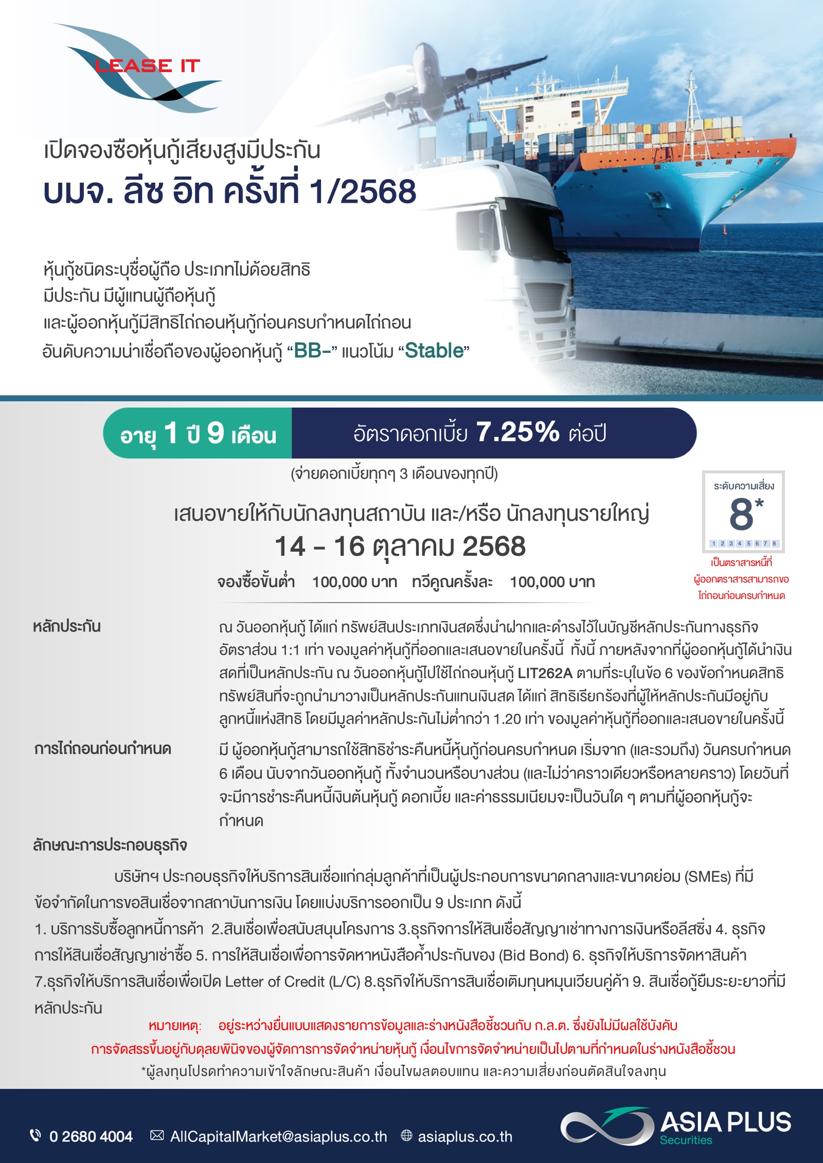 เปิดจองหุ้นกู้เสี่ยงสูงมีประกัน บริษัท ลีซ อิท จำกัด (มหาชน) - LIT