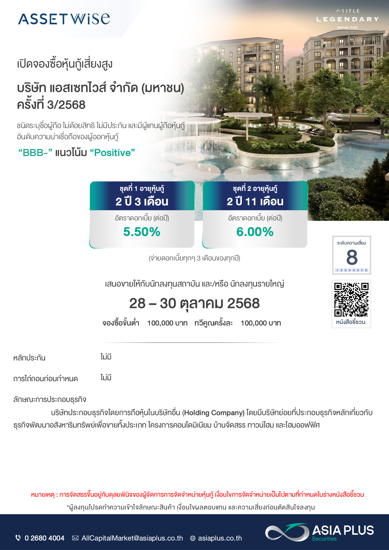 เปิดจองหุ้นกู้เสี่ยงสูง บริษัท แอสเซทไวส์ จำกัด (มหาชน) - ASW