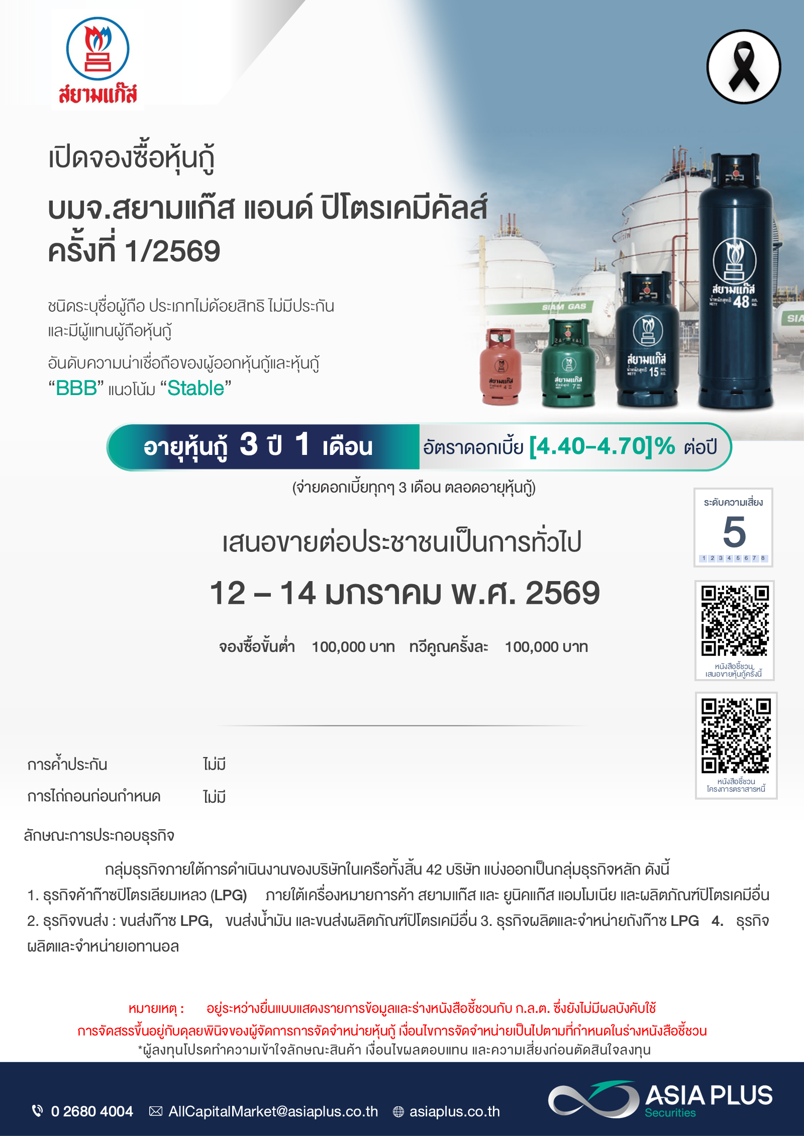 เปิดจองหุ้นกู้ บริษัท สยามแก๊ส แอนด์ ปิโตรเคมีคัลส์ จำกัด (มหาชน) - SGP