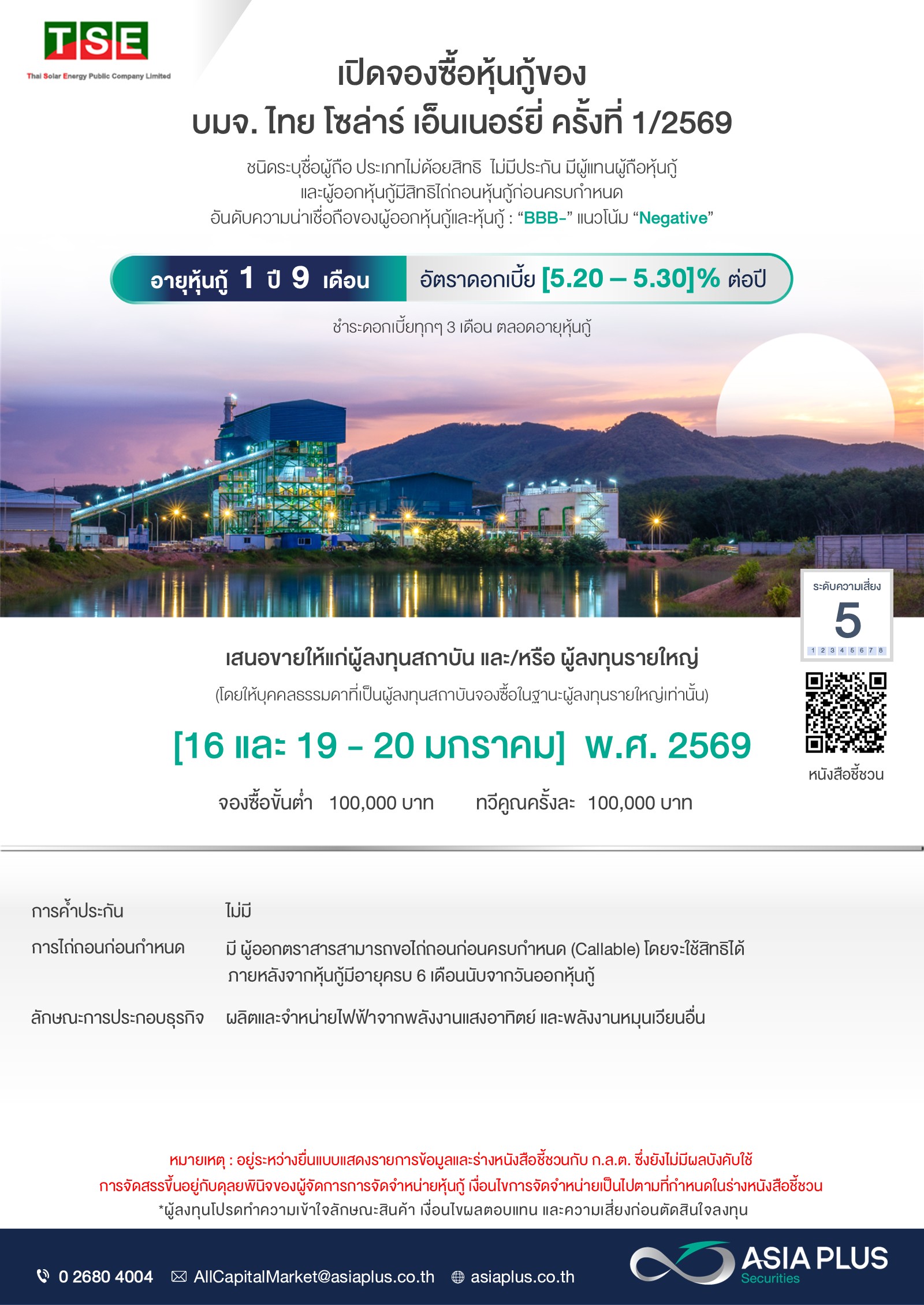 เปิดจองหุ้นกู้ บริษัท ไทย โซล่าร์ เอ็นเนอร์ยี่ จำกัด (มหาชน) - TSE