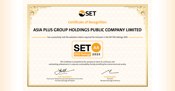 บริษัท เอเซีย พลัส กรุ๊ป โฮลดิ้งส์ จำกัด (มหาชน) ได้รับการประเมิน SET ESG Ratings ประจำปี 2568 ด้วยผลการประเมินระดับ AA สะท้อนถึงมาตรฐานการดำเนินงาน...